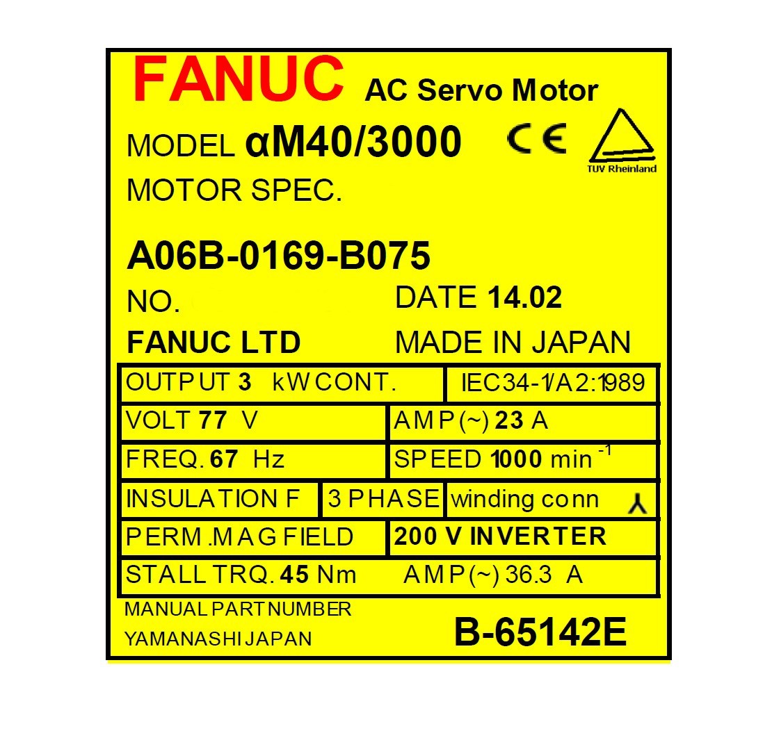 Products / Fanuc / Servo Motors / AC Servo / Fanuc A06B-0169-B075 AC Servo Motor AM40/3000 I64, 77V, 67Hz *1 YEAR WARRANTY*