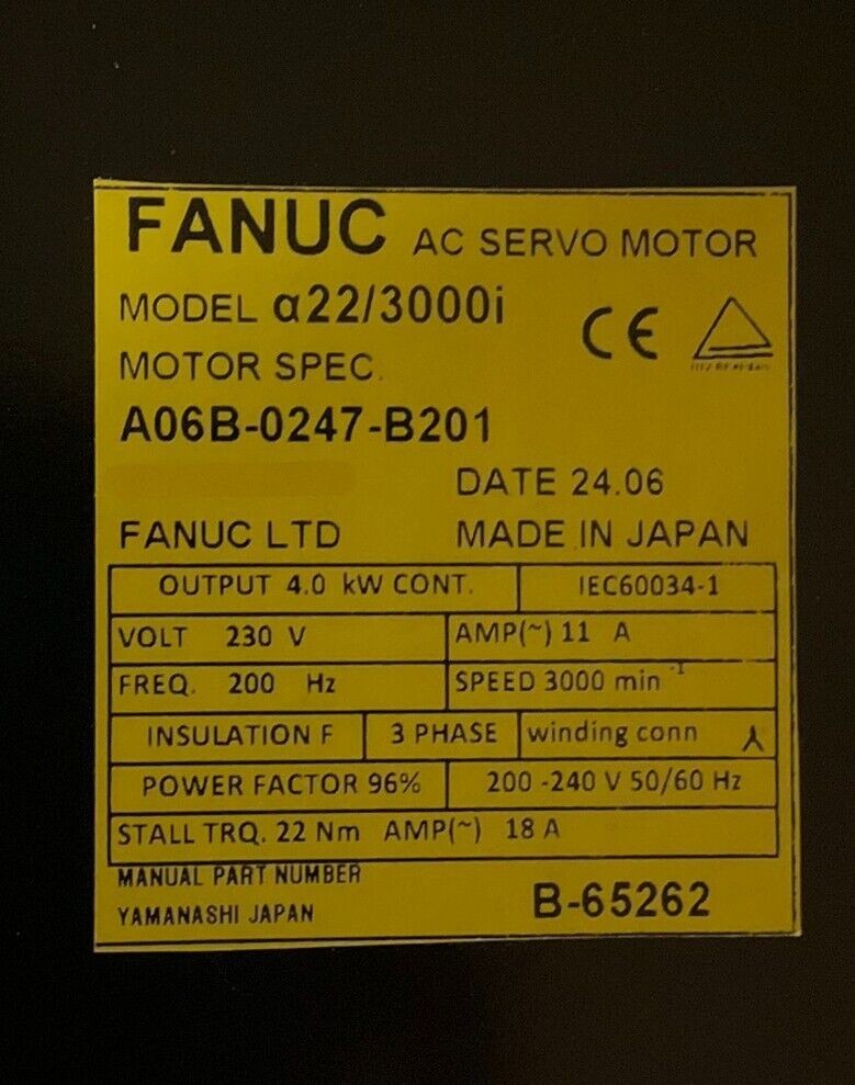 Products / Fanuc / Servo Motors / AC Servo / Fanuc A06B-0247-B201 AC MOTOR AiF22/3000. ST, KEY *1 YEAR WARRANTY*