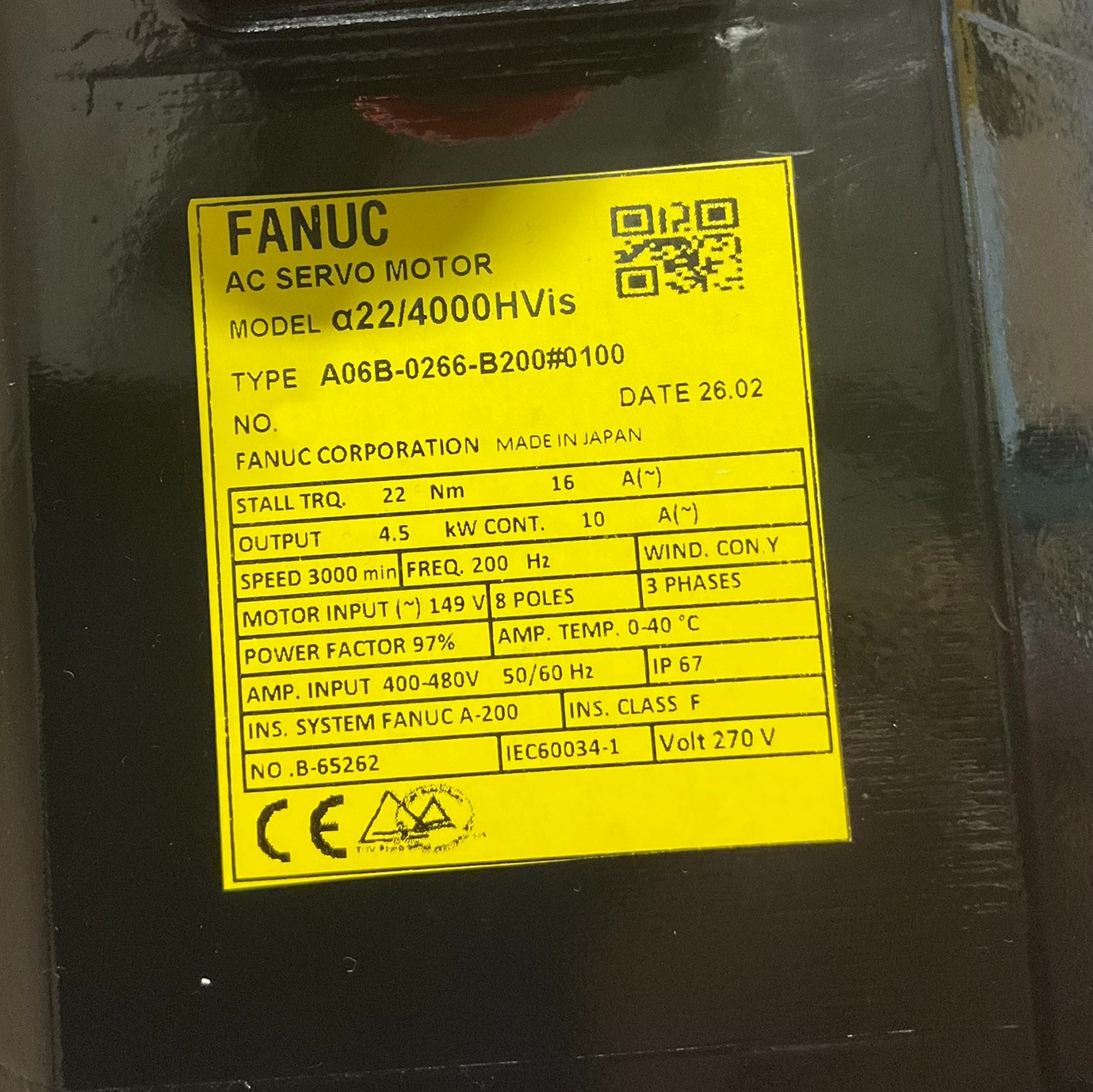 Products / Fanuc / Servo Motors / AC Servo / Fanuc A06B-0266-B200#0100 AC MOTOR AIS22/4000HV IP67 STR *1 YEAR WARRANTY*